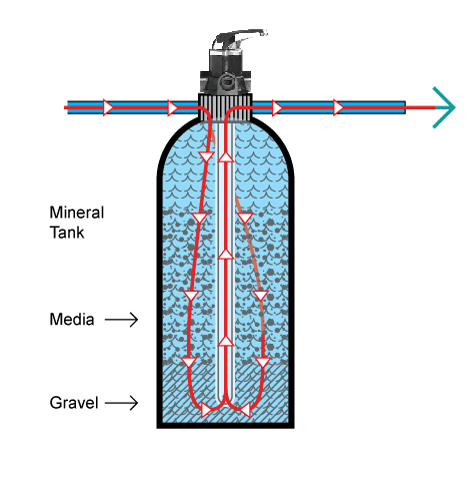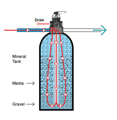 The picture above shows the filter in "service" position. This is how it works when it is doing the job it is designed to do. The unfiltered water enters from the left and is routed by the control valve into the filter tank. The water then filters slowly through the medium until it reaches the bottom of the tank where it is collected through a specially-designed sieved "basket" at the bottom of the center tube seen in the picture. The filtered water then passes up through the center tube, called a "riser" passes through the control valve and exits the right side of the filter.